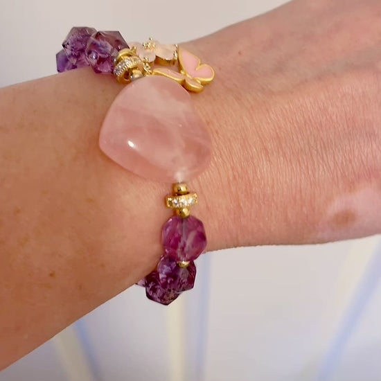 Expertly crafted, this Amethyst star cut with rose quartz heart boasts a unique design that combines two powerful crystals. Amethyst is known for its calming properties and the rose quartz heart promotes love and healing. Add this stunning piece to your collection and experience the benefits of these crystals.
